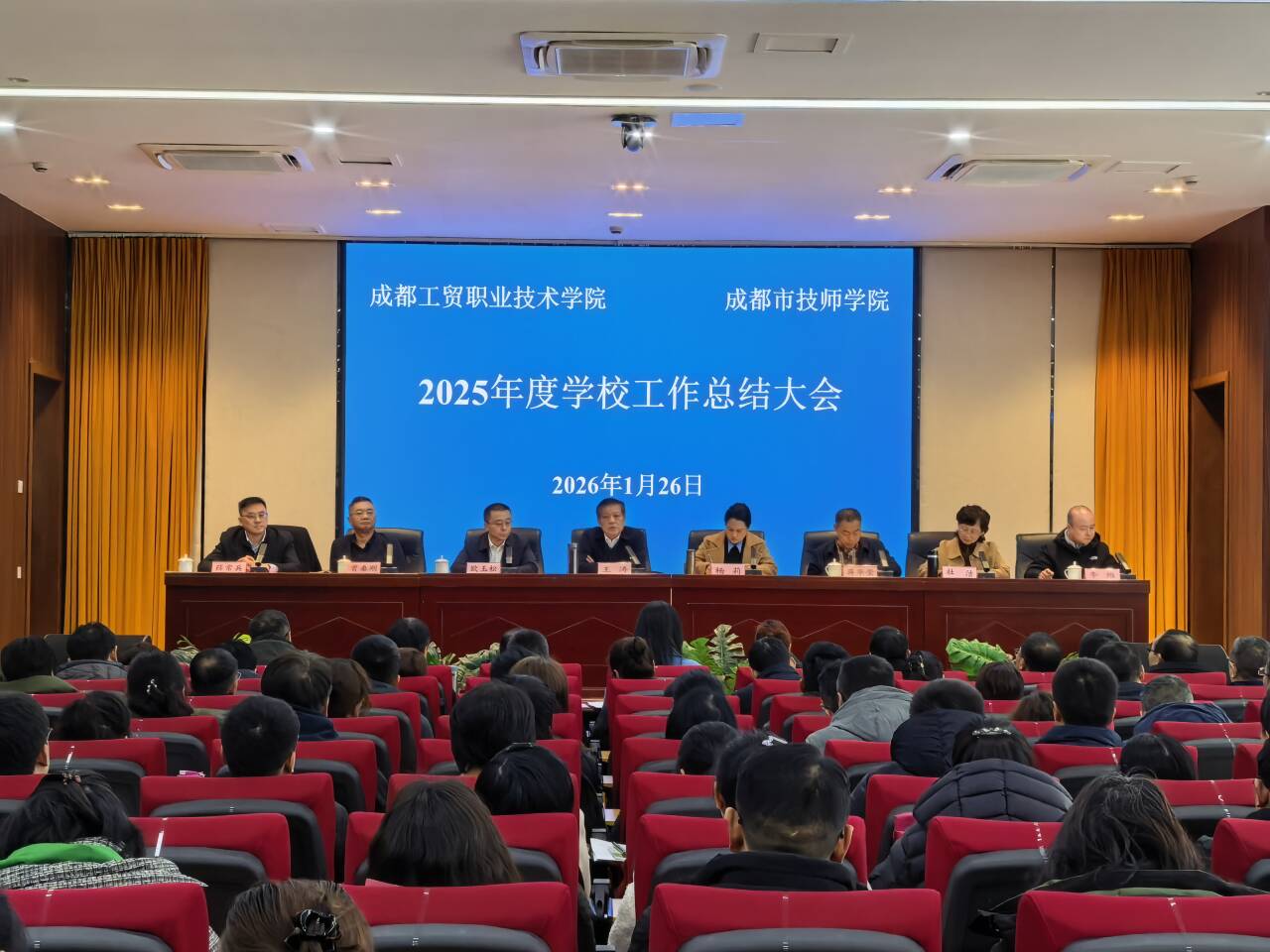 1月26日,学校召开2025年度总结大会。会议全面回顾学校2025年各项工作取得的突破性成果,系统部署2026年重点任务,为学校在“十四五”圆满收官、“十五五”顺利开局的关键节点,锚定方向、凝聚力量。党委书记王涛就2026年工作提出明确要求,党委副书记杨莉作2025年度工作总结报告,全体领导班子出席会议。学校科级以上干部、正教授、博士、教研室主任、“立园满园”驻园教师参加会议。会上,王涛立足成都市委十四届八次全会发展战略,结合学校发展实际,围绕“成就、危机、奋进”三个关键词,对学校的现状进行了分析,对下一步发展提出了核心要求。他谈到,近年来学校发展生态越来越好,广大教职工凝心聚力,努力拼搏,干事创业氛围浓厚;学校职技融通办学特色凸显,工匠文化育人成效显著,学生竞争力越来越强,就业率稳居全省前列;学校综合荣誉越来越多,综合排名跨越式提升,教职工幸福感、自豪感倍增。在收获成就的同时,我们要清醒认识到面临职教发展及AI时代变迁带来的危机,他指出,我们要锚定教育强国目标,紧抓“新双高”建设机遇,